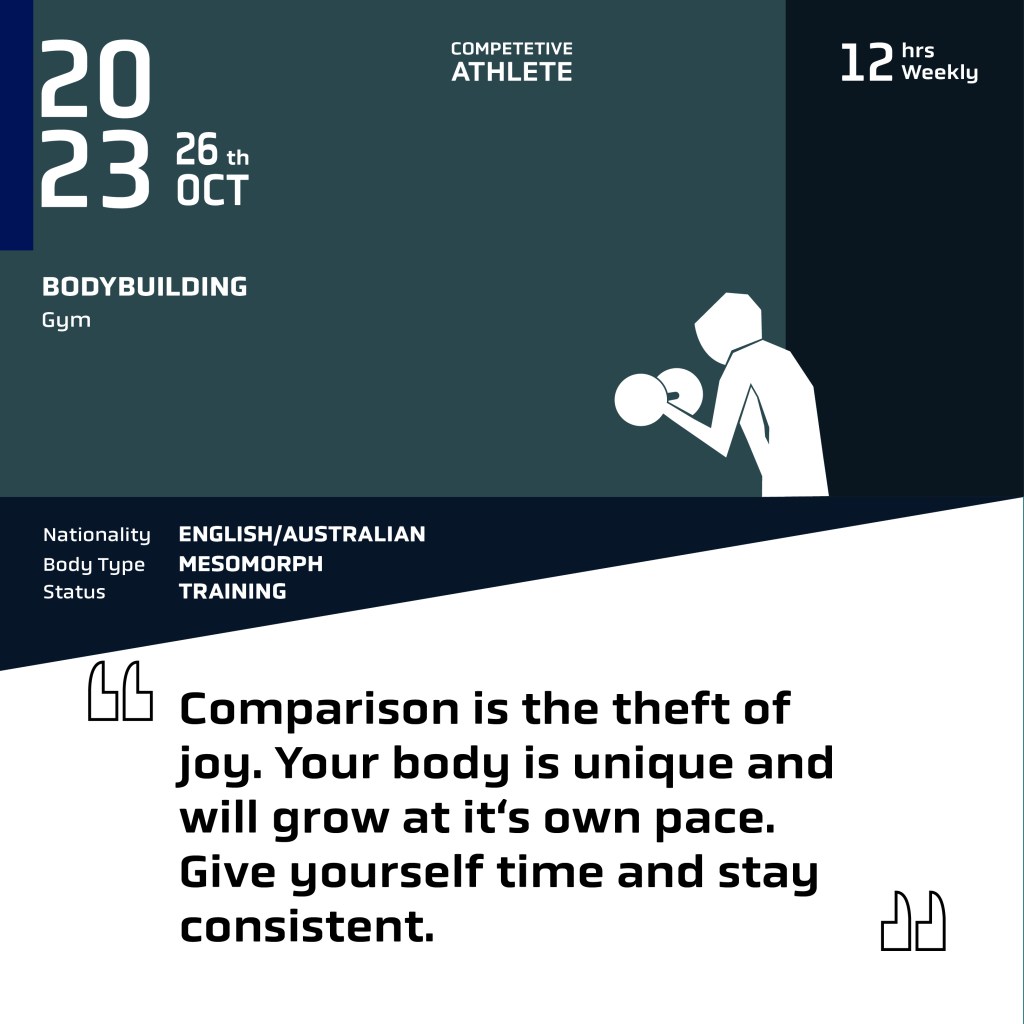 Morph will aim to assure viewers that everyone grows, develops and loses fat at unique rates. You have a different body type from others and should not be discouraged if your fitness progress in aesthetics or performance is relatively different from others. Messages with these principles will be addressed through quotes from featured athletes as they relate to their personal body dysmorphia experiences. The quotes will promote relatability and act as a catalyst to invite viewers to comment on their similar experiences in the comment section.