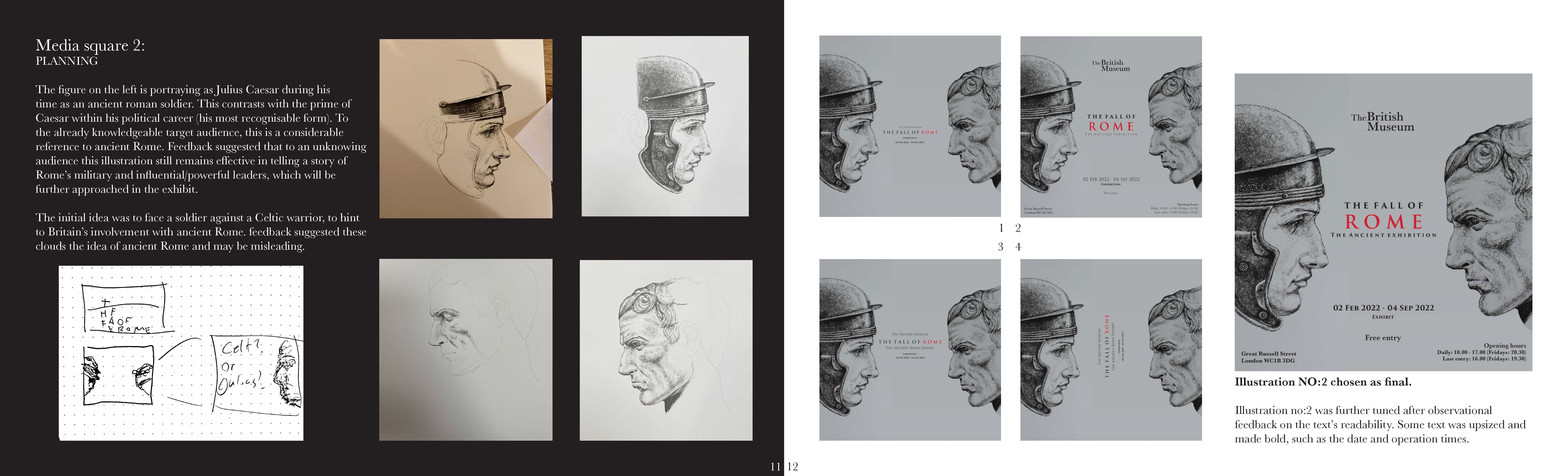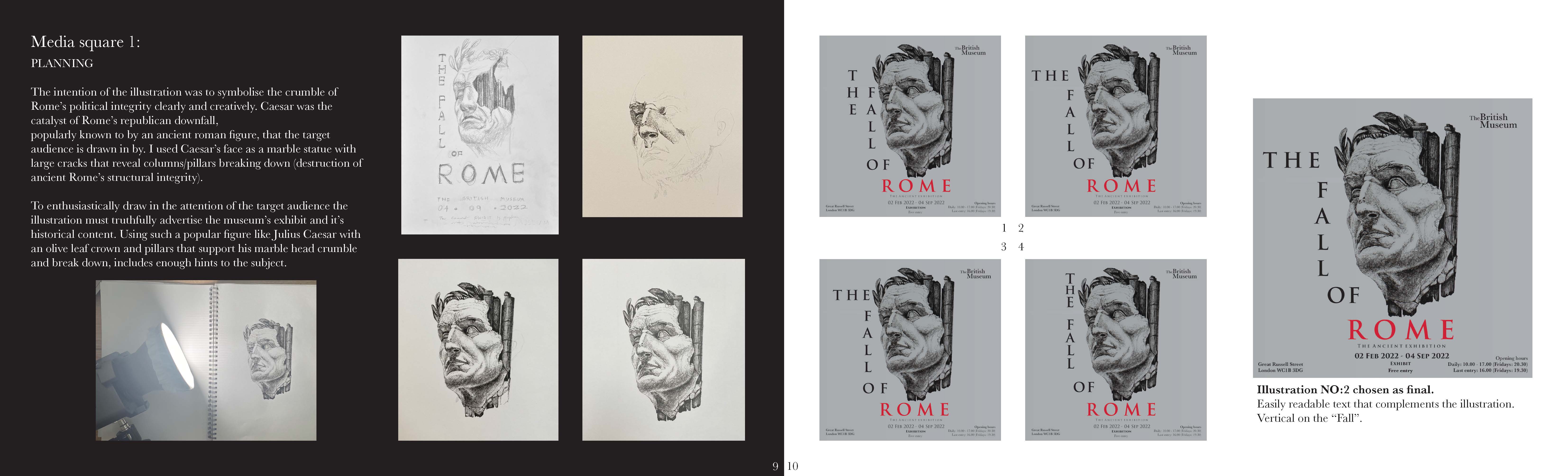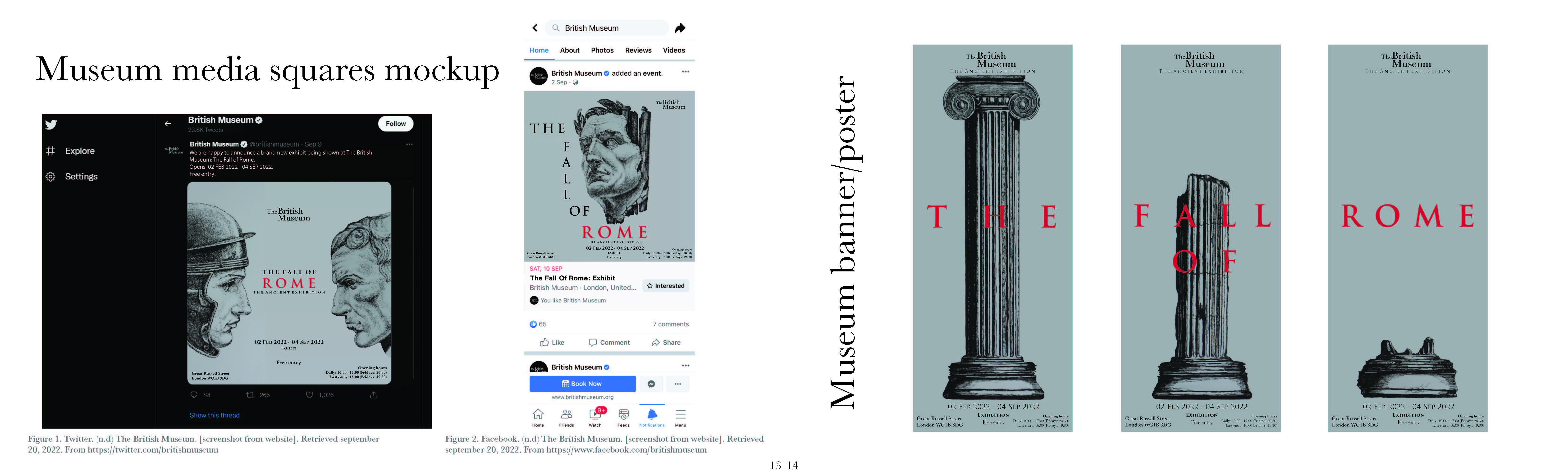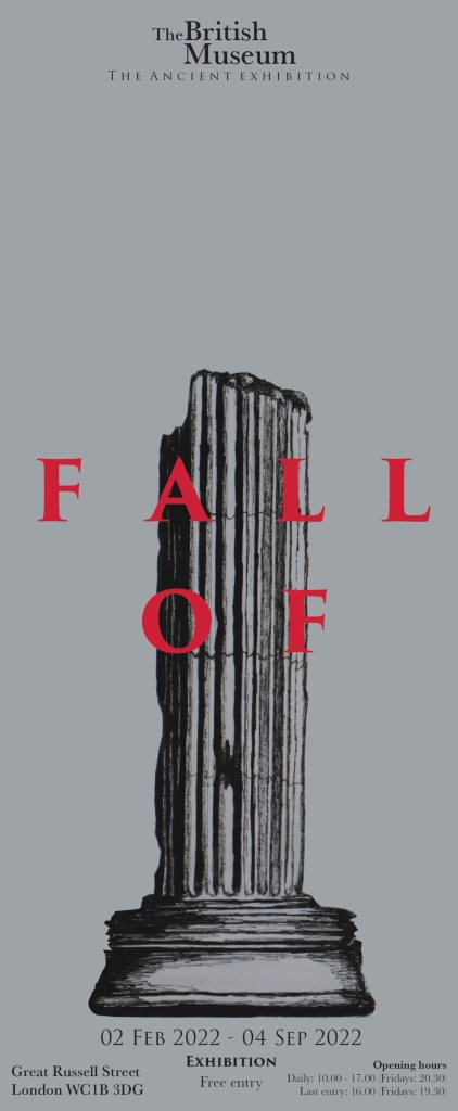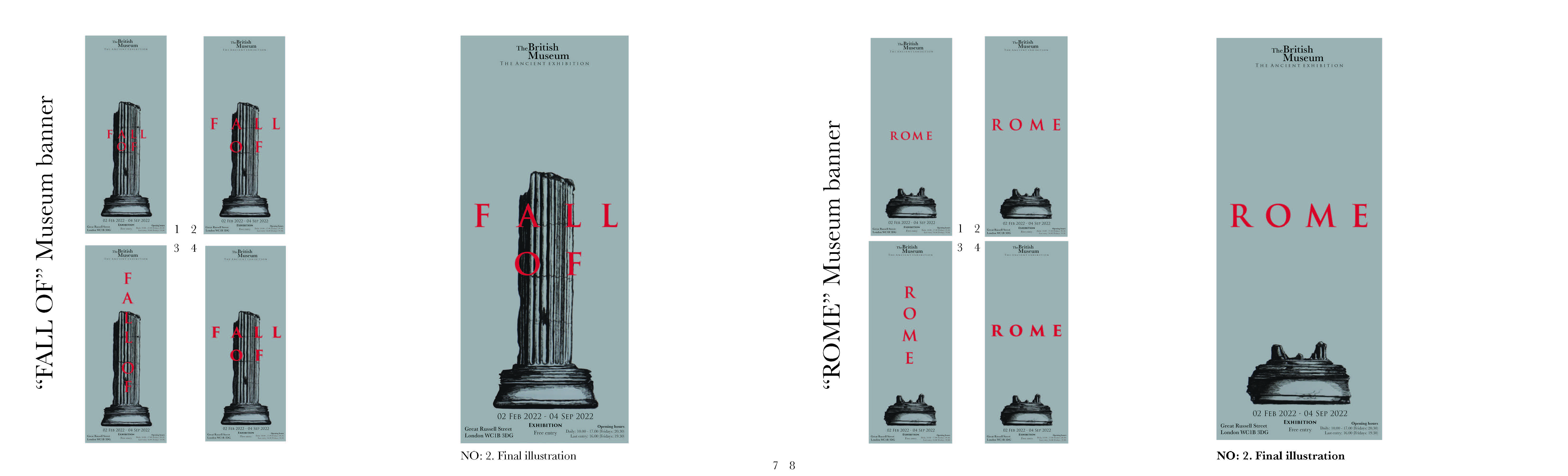 One of the most noticeable relations to the ancient world and ancient Rome is the pillars, and today some remain as empty husks. However, their ancient origins are recognised by most of the world. The banner’s illustrations visually symbolise the collapse of Rome through the presentation of decaying pillars. The audience’s interpretation of the banners promotes a clear indication of the exhibit’s Roman