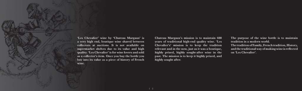 The purpose of the wine bottle is to maintain tradition in a modern world. The tradition of Family, French tradition, History, and the traditional way of making wine is reflected on ‘Les Chevalier’.
