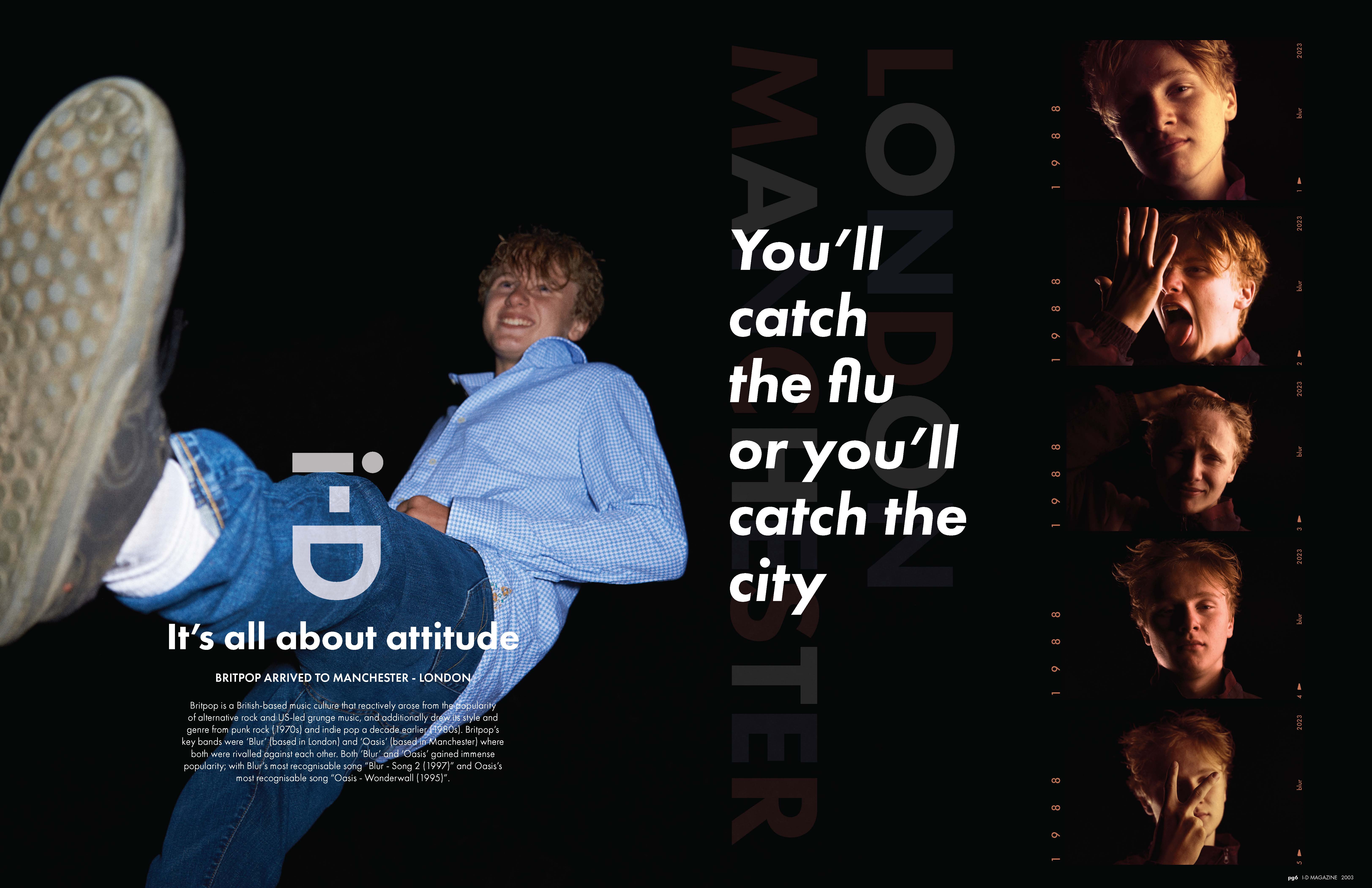 The concept of these photographs will be tailored by ID magazine’s identity and style; which focuses on the creative fields to inspire youth culture with the use of graphic design techniques and innovative typographic treatment to amplify the photograph’s cultural reference. ID magazine’s stylistic appeal accompanied by the initial late 1990s appeal of Britpop culture from English youth amplifies contemporary fashion appeal with nostalgia and creates new forms of expression.